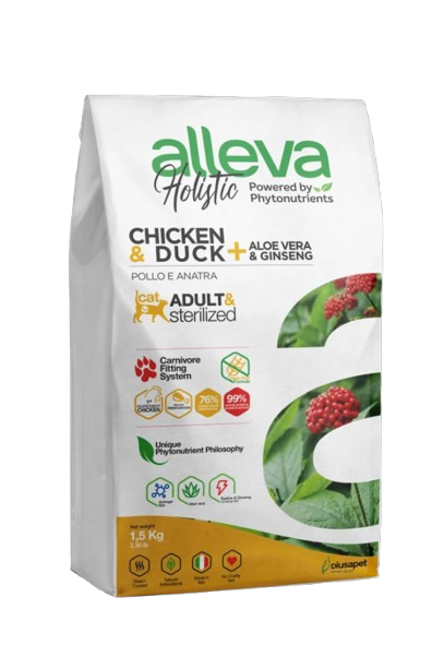 Les croquettes Alleva Holistic sont préparées à partir de viande de poulet et de canard, deux sources de protéines nobles qui garantissent une alimentation riche et équilibrée. La viande de poulet est facile à digérer et riche en acides aminés essentiels au bon fonctionnement de l’organisme du chat, tandis que le canard offre une protéine plus riche et plus savoureuse, particulièrement appréciée des félins. Ensemble, ces ingrédients fournissent une protéine de haute qualité qui soutient la masse musculaire et la vitalité de votre chat.