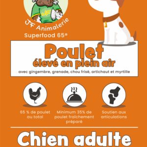Poulet déshydraté (32%), poulet désossé frais (20%), riz brun, graisse de poulet, amidon de pois, courge séchée (5%), pulpe de betterave séchée, huile de poisson, foies de poulet, racine de chicorée (source d’inuline et F.O.S.), levures de bière séchées et inactivées (source de M.O.S.), phosphate dicalcique, carbonate de potassium, glucosamine, sulfate de chondroïtine, jus de yucca.