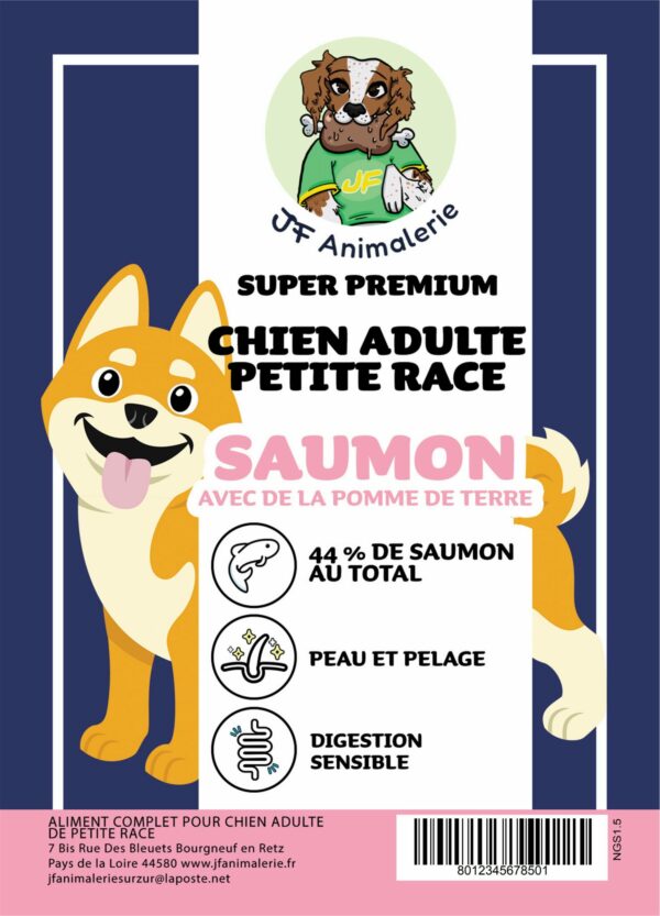 Croquettes JF Animalerie super premium au saumon avec de la pomme de terre pour chien adulte petite race.