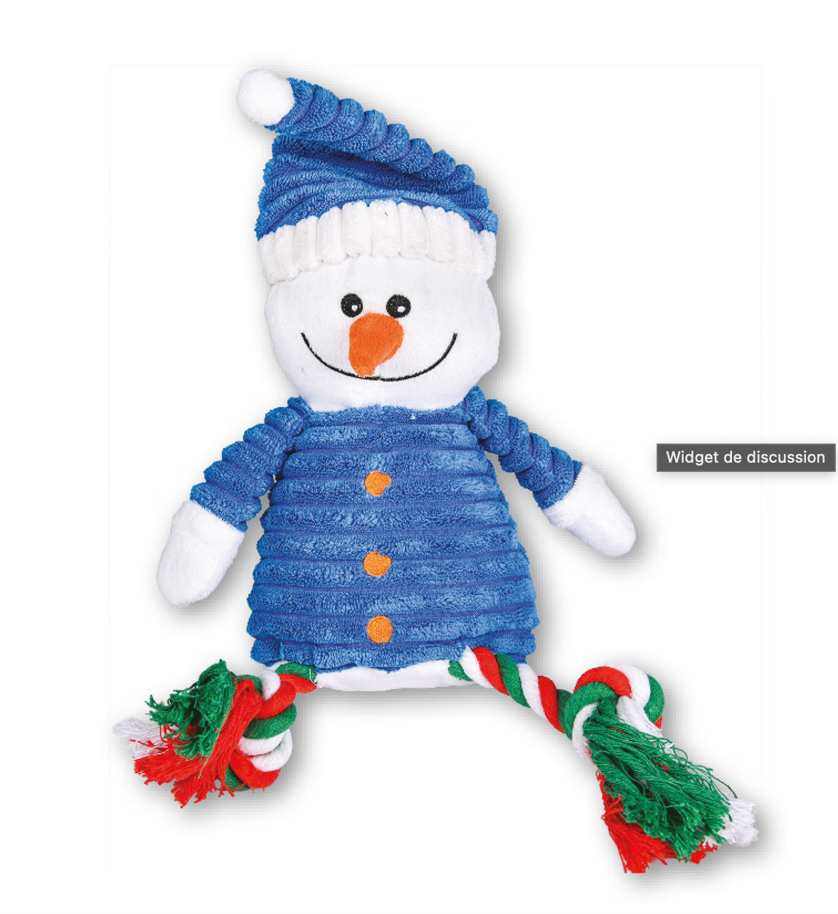 Peluche de Bonhomme de neige sonore au niveau du ventre avec ses 2 jambes en corde. Cette peluche satisfera l’instinct de votre animal en plus de l’amuser. Un beau cadeau pour Noël.