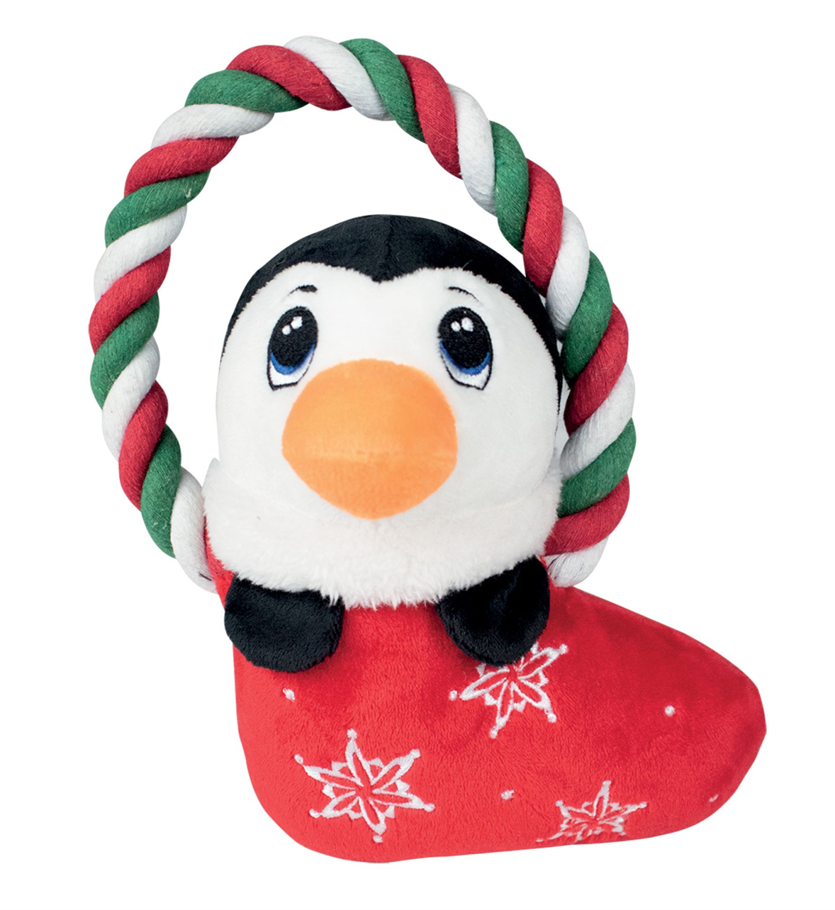 Une peluche Pingouin de Noël pour chien avec corde pour gâter votre petit compagnon le jour de Noël. Un couineur se cache à l’intérieur de la peluche.