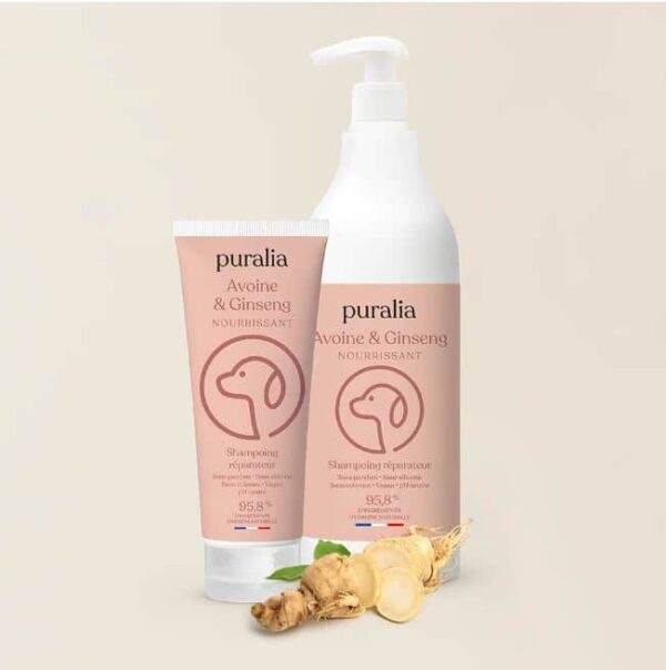 Offrez à votre chien un moment de détente et de bien-être lors de son bain avec le shampoing réparateur, spécialement conçu pour lui. Ce shampoing associe l’avoine et le ginseng, qui contribuent à redonner de l’éclat au poil et à fortifier le pelage. Le ginseng est reconnu pour ses bienfaits revitalisants et antioxydants afin de prendre soin du pelage délicat tout en redonnant de l’élasticité aux poils. La formule répare et nourrit en profondeur et aide à stimuler la pousse tout en respectant l’équilibre naturel de la peau. Son parfum délicat laissera une odeur agréable sur le pelage de votre compagnon.